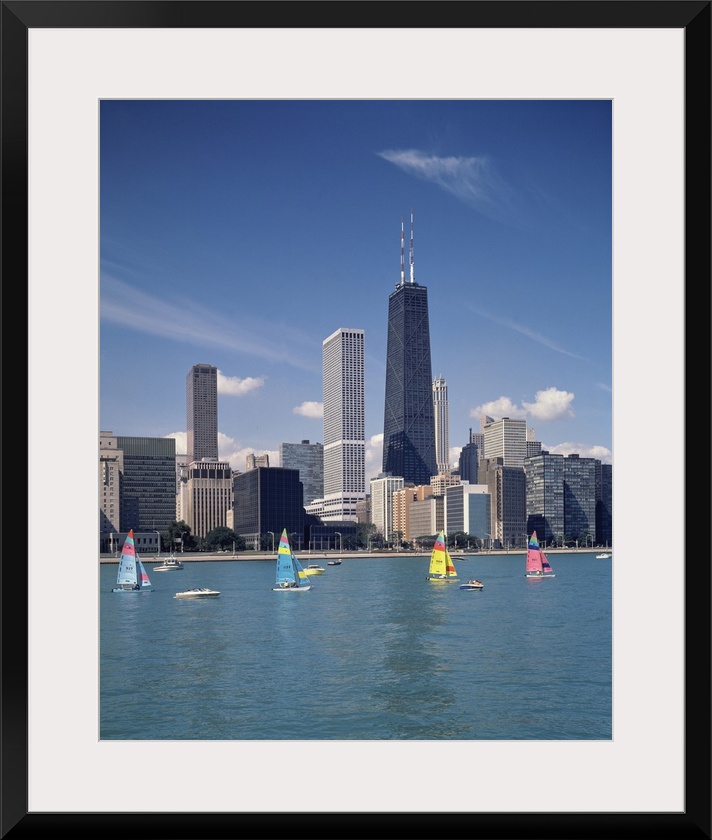 <p>Vertical photograph of several boats on Lake Michigan in front of Chicago skyscrapers in Illinois.</p>