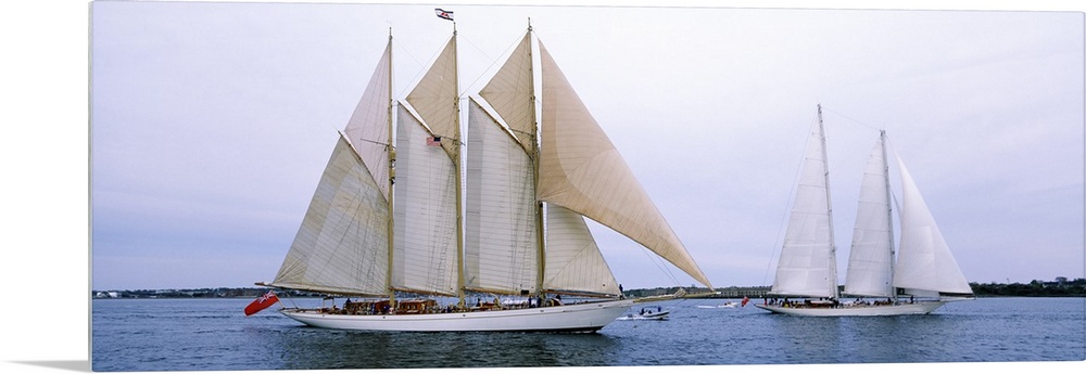 <p>Panoramic canvas photo of two big sailboats in a bay.</p>