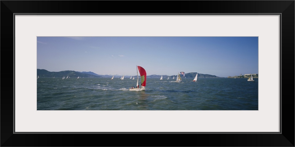 <p>Panoramic photograph ocean with scattered boats with sails and mountains in the distance under a clear sky.</p>