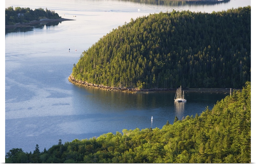 <p>Sailboats moored in Valley Cove as seen from Acadia Mountain in Maine's Acadia National Park. Flying Mountain is behind the boats. Entrance to Somes Sound.</p>