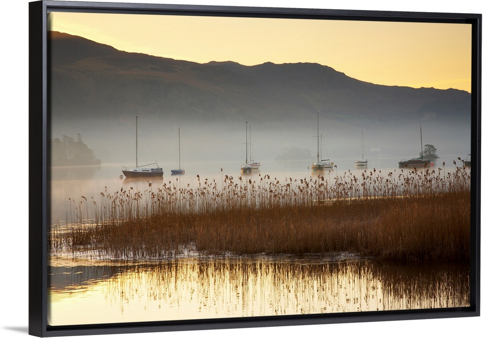 <p>Sailboats On Derwent Water In Mist, Lake District National Park, Cumbria, England</p>