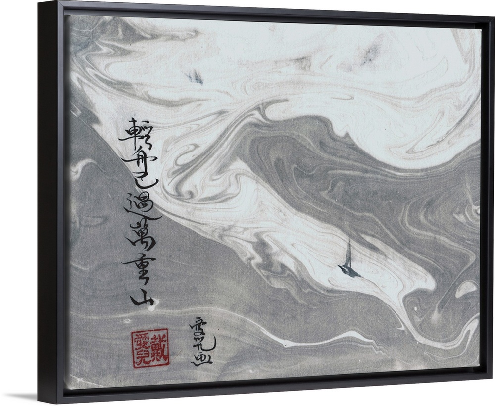 <p>This is a more abstract piece of my Flow series. The landscape is created with free flowing ink on water. I added a tiny boat with a Chinese brush. It is inspired by the Tang dynasty poem by Li Bai. The calligraphy on the painting is a phrase from that poem, "The skiff has sailed past ten thousand hills In an attempt to achieve balance between nature and man"</p>