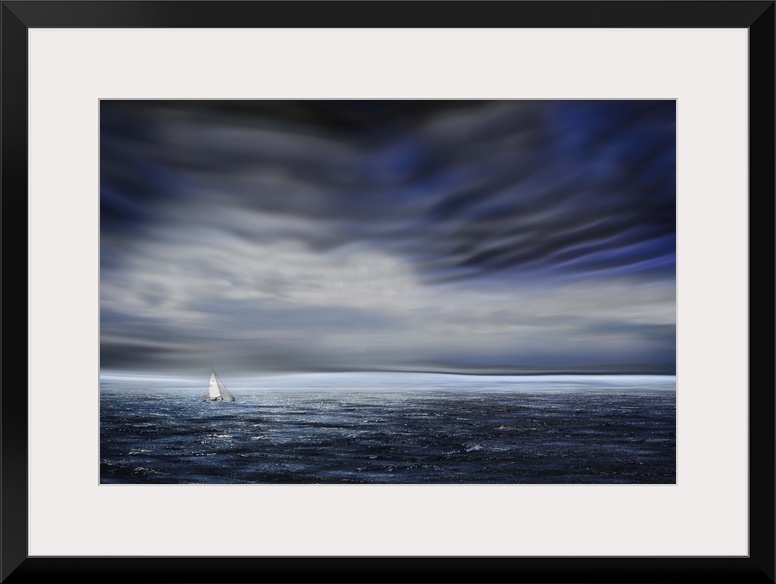 <p>A small sailboat dwarfed by the vastness of the open ocean, under dark stormclouds.</p>