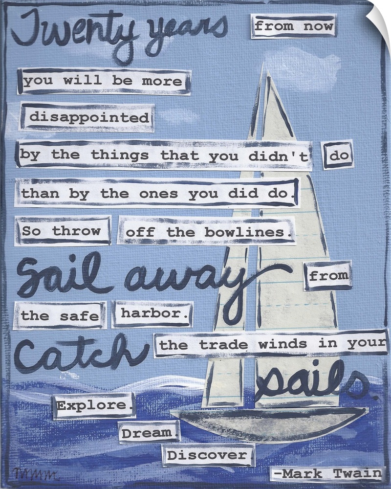 <p>Twenty Years From Now You Will Be More Disappointed By The Things That You Didnt Do Than By The Ones You Did Do. So Throw Off The Bowlines. Sail Away From The Safe Harbor. Catch The Trade Winds In Your Sails. Explore. Dream. Discover. -Mark Twain</p>