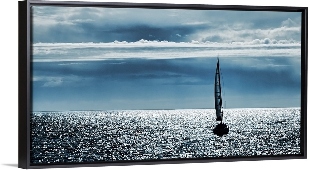 <p>Silhouettes of a yacht sailing alone in the ocean to the horizon.</p>