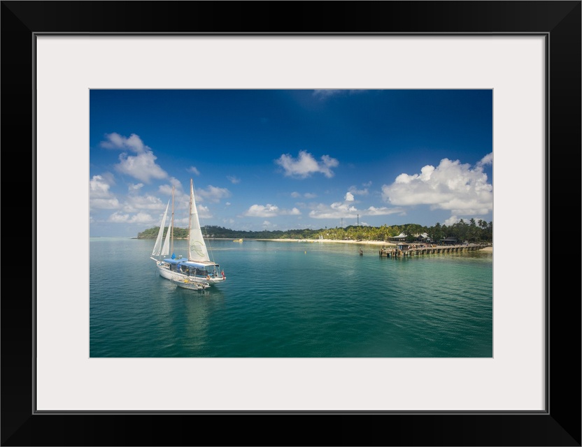 <p>Sailing boat anchoring on Mana Island, Mamanuca Islands, Fiji, South Pacific</p>