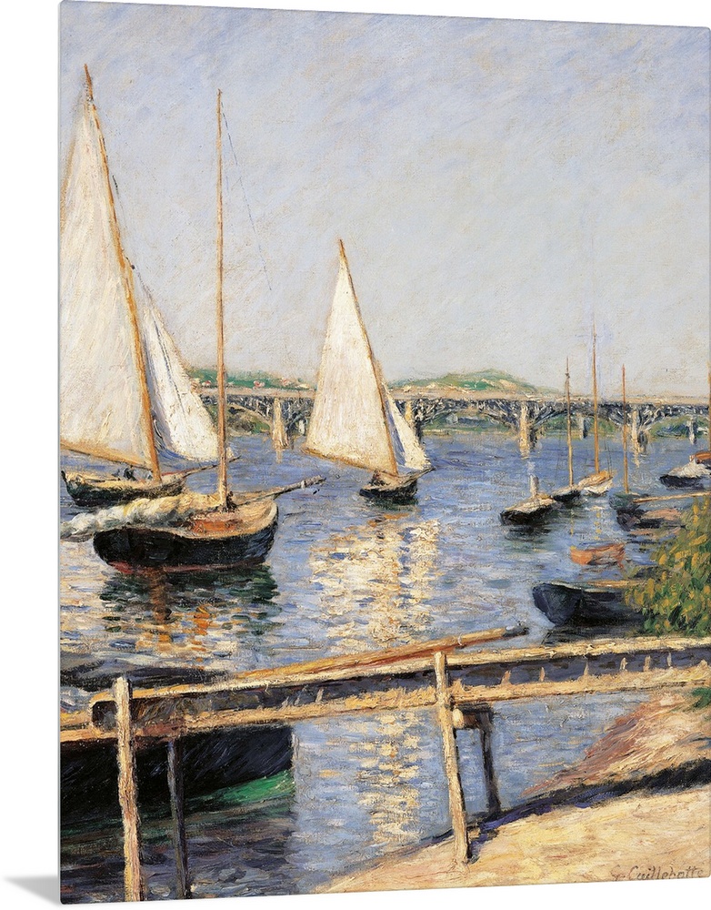 <p>Sailing Boats at Argenteuil, by Gustave Caillebotte, 1888 about, 19th Century, oil on canvas, cm 35,5 x 55 - France, Ile de France, Paris, Muse dOrsay. All. Boats sailing boats at Argenteuil dock light blue azure shadows boats bank water sail white. (2512</p>