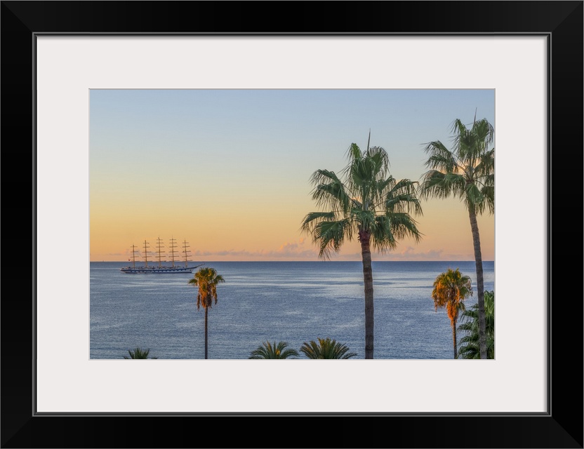 <p>Sailing cruiser moored off coast with palm trees and Mediterranean seen from Le Suquet (old town), Cannes, Alpes-Maritimes, French Riviera, France</p>