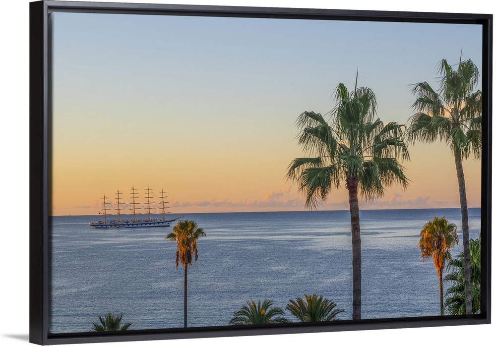 <p>Sailing cruiser moored off coast with palm trees and Mediterranean seen from Le Suquet (old town), Cannes, Alpes-Maritimes, French Riviera, France</p>