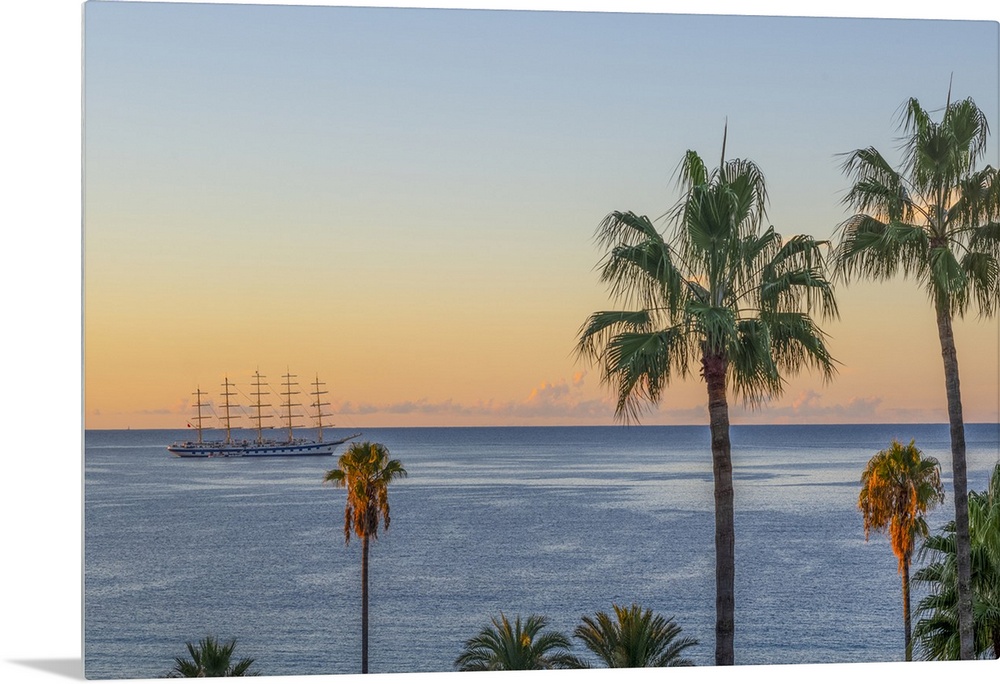 <p>Sailing cruiser moored off coast with palm trees and Mediterranean seen from Le Suquet (old town), Cannes, Alpes-Maritimes, French Riviera, France</p>