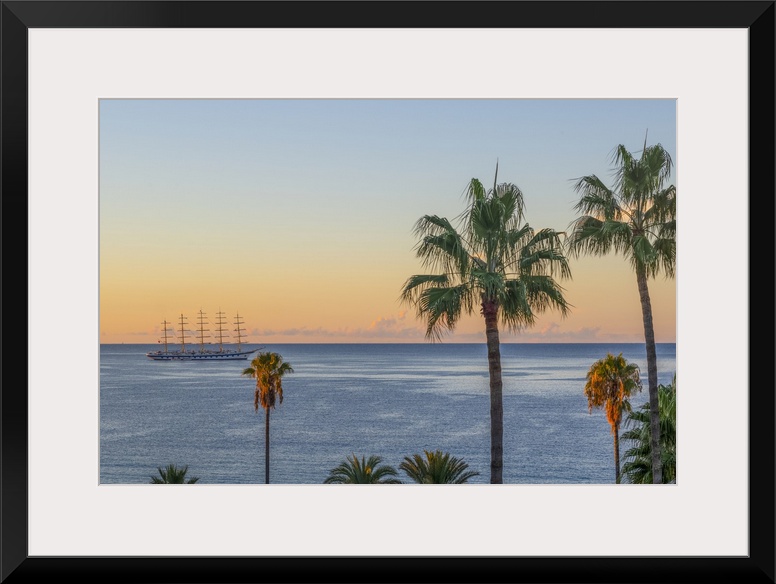 <p>Sailing cruiser moored off coast with palm trees and Mediterranean seen from Le Suquet (old town), Cannes, Alpes-Maritimes, French Riviera, France</p>