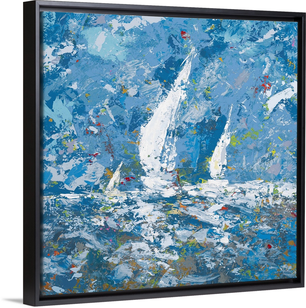 <p>Square, giant abstract painting of three sailboats in the water, beneath a blue sky. Painted with chaotic brushstrokes and textures.</p>