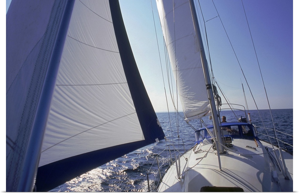 <p>Up-close photograph of sail on a boat with ocean in the distance under a clear sky.</p>