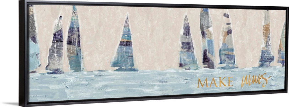 <p>A contemporary abstract painting of nine sailboats on the water with blue, muted tones and the phrase "Make Waves" written in gold at the bottom.</p>