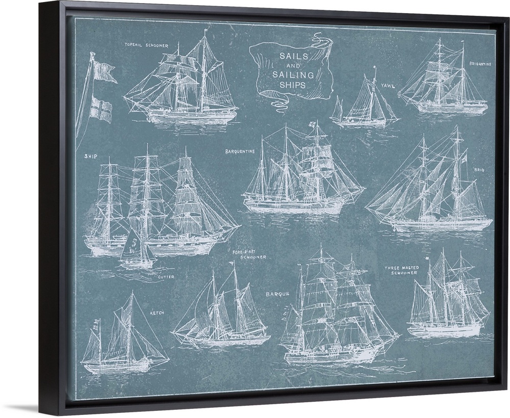 <p>Artwork of a vintage blueprint chart of various old sailing ships.</p>