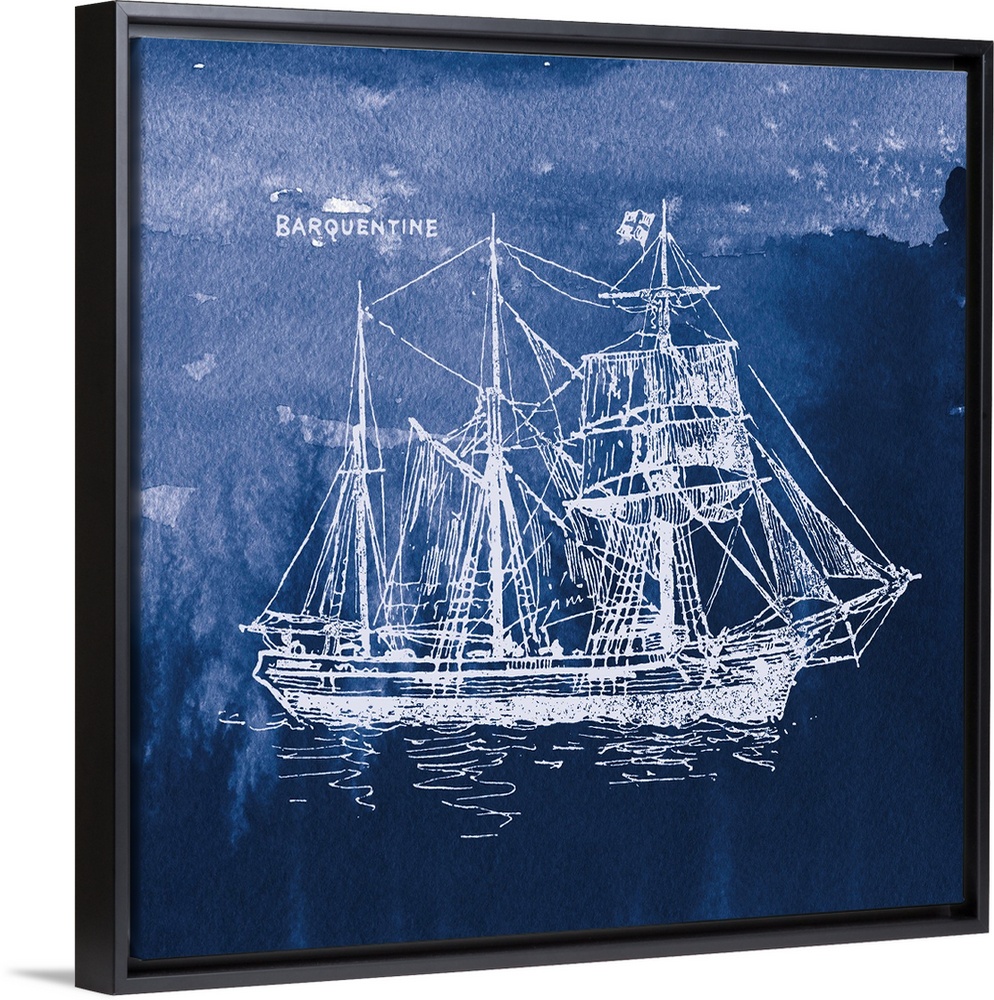 <p>Square art with a white silhouette of a sailboat on an indigo watercolor background and "Barquentine" written in the corner.</p>