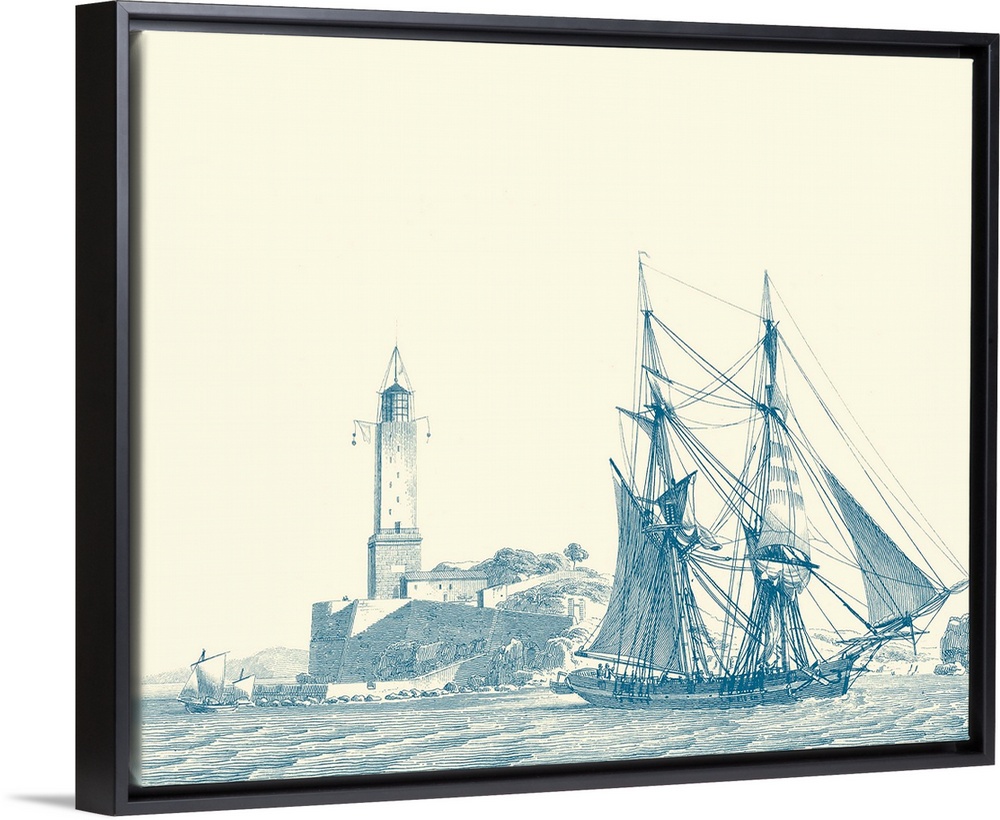 Art Coastal Blue Wall Art Drawing Illustrations Lighthouse Transportation Boat Ship Vintage Art