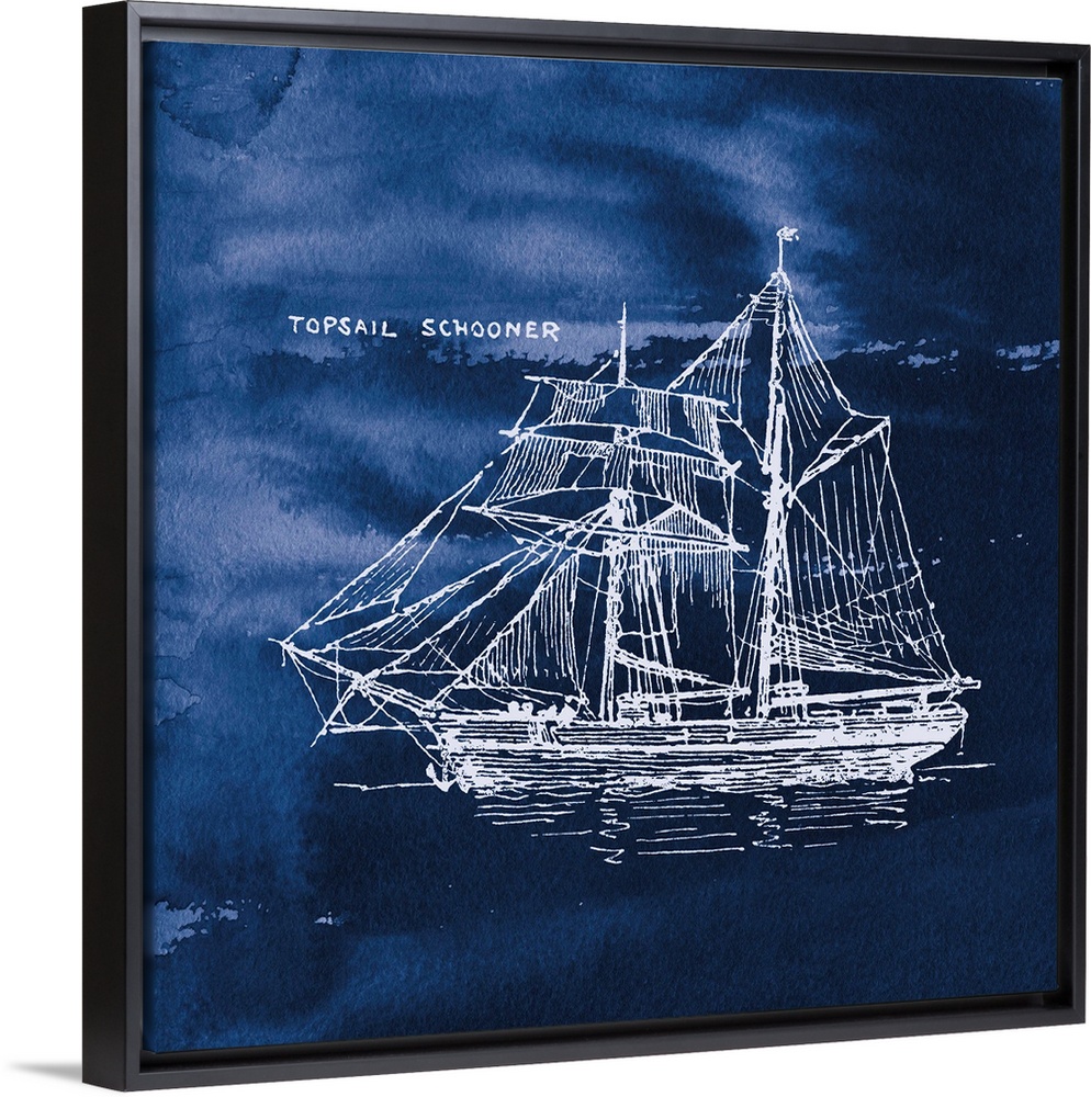 <p>Square art with a white silhouette of a sailboat on an indigo watercolor background and "Topsail Schooner" written in the corner.</p>