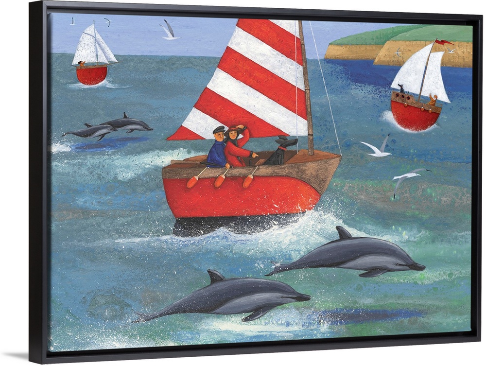 <p>Contemporary nautical themed painting of people sailing in the bay with dolphins jumping out of the water.</p>