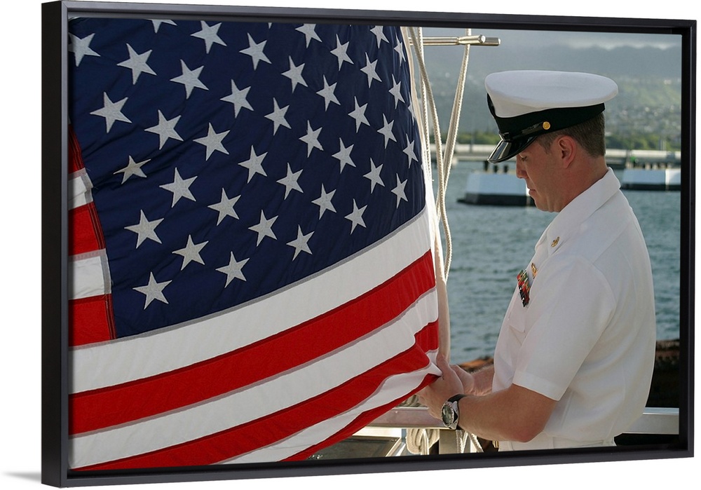 <p>Sailor raises an American flag above the USS Arizona Memorial in Pearl Harbor, Hawaii.</p>