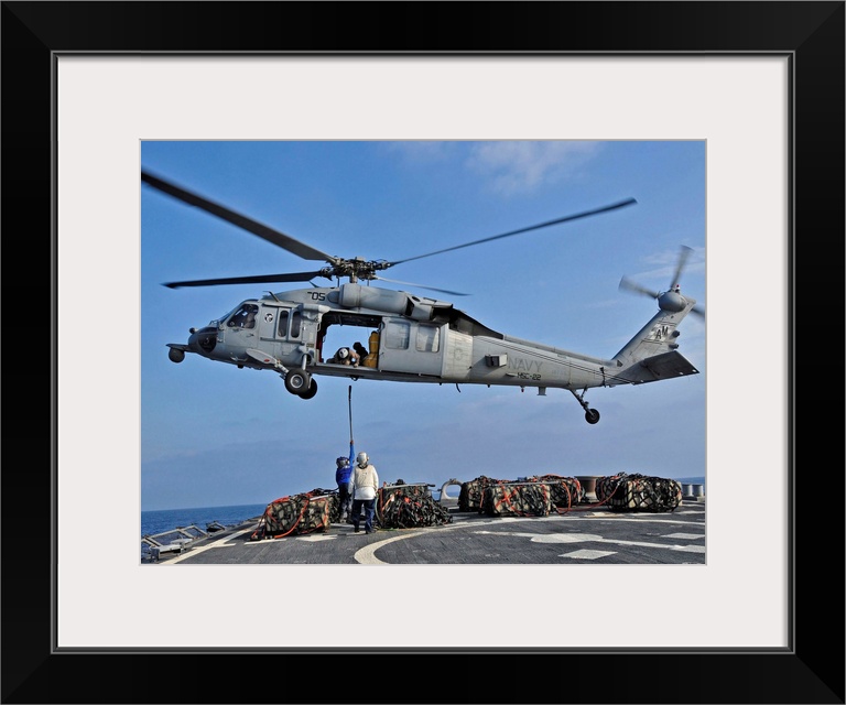 <p>Mediterranean Sea, March 3, 2011 - Sailors aboard the guided-missile destroyer USS Barry (DDG-52) attach a cargo pennant to a MH-60S Sea Hawk helicopter.</p>