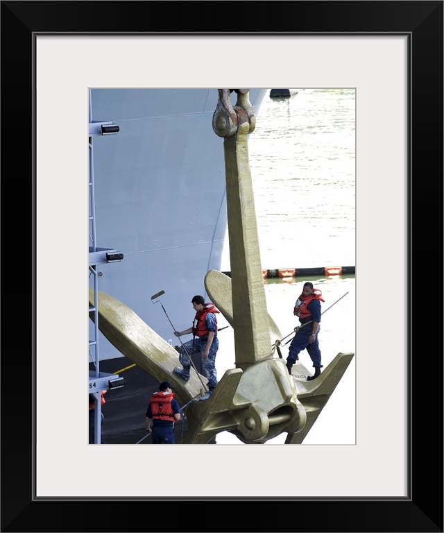 <p>Everett, Washington, June 6, 2012 - Sailors paint the starboard anchor of the aircraft carrier USS Nimitz gold in preparation for the ship's Rim of the Pacific (RIMPAC) cruise.</p>
