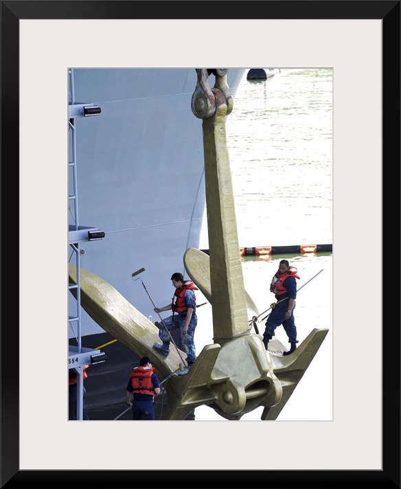 <p>Everett, Washington, June 6, 2012 - Sailors paint the starboard anchor of the aircraft carrier USS Nimitz gold in preparation for the ship's Rim of the Pacific (RIMPAC) cruise.</p>