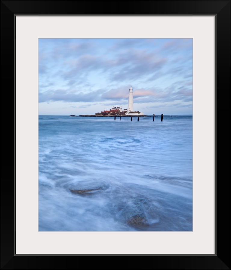 <p>A dramatic image of swirling waves beneath a white Lighthouse and a blue sky at St. Mary's Bay, Newcastle, UK.</p>