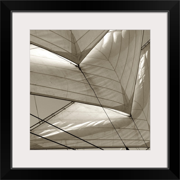 <p>Monochromatic image of multiple sails on a sailboat.</p>