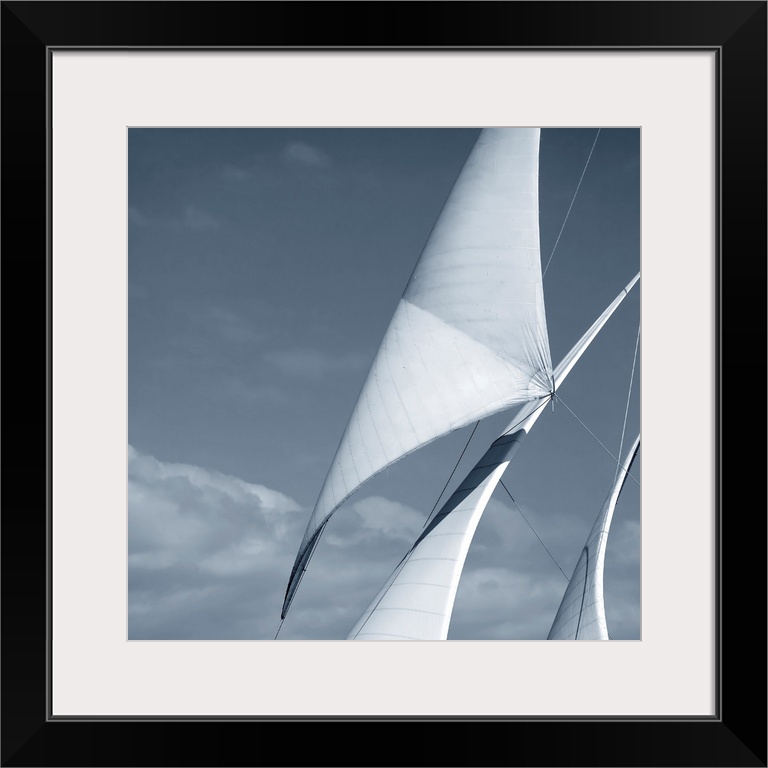 <p>Black and white photograph of three sails against a cloudy sky.</p>