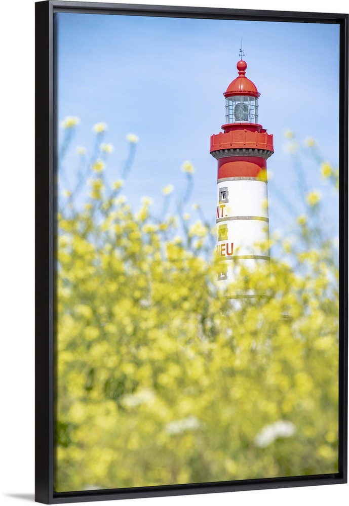 <p>Saint Mathieu red and white lighthouse under a blue sky and behind yellow flowers in Brittany.Portrait mode.</p>