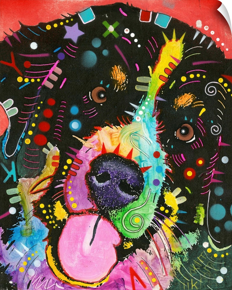 <p>Illustration of a Swiss Mountain Dog with colorful geometric abstract markings on a red background.</p>