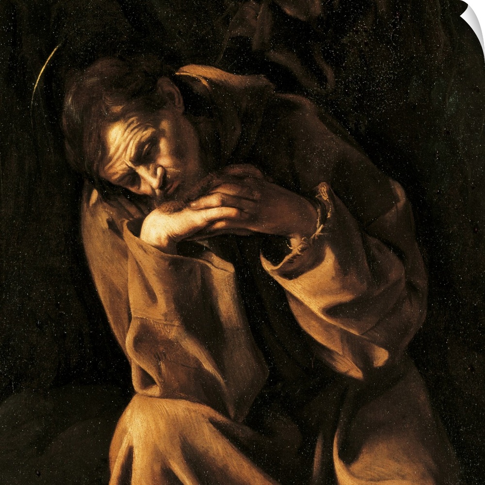 <p>Saint Francis in Prayer, by Merisi Michelangelo known as Caravaggio, 17th Century, 1606 -1607 about, oil on canvas, cm 128 x 90 - Italy, Lombardy, Cremona, Ala Ponzone Civic Museum. Detail. The saint is absorbed in prayer. The man is kneeling, in a habit</p>