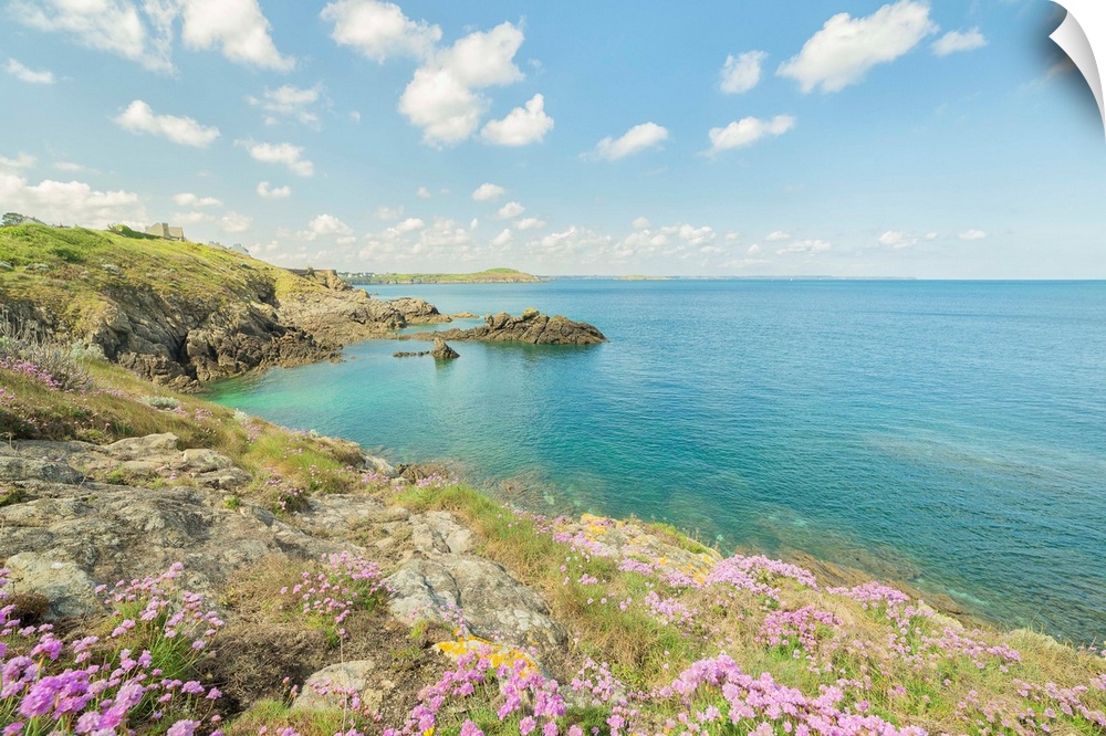 <p>Pink flowers on the coast of St. Lunaire in northern France, overlooking a turquoise ocean.</p>