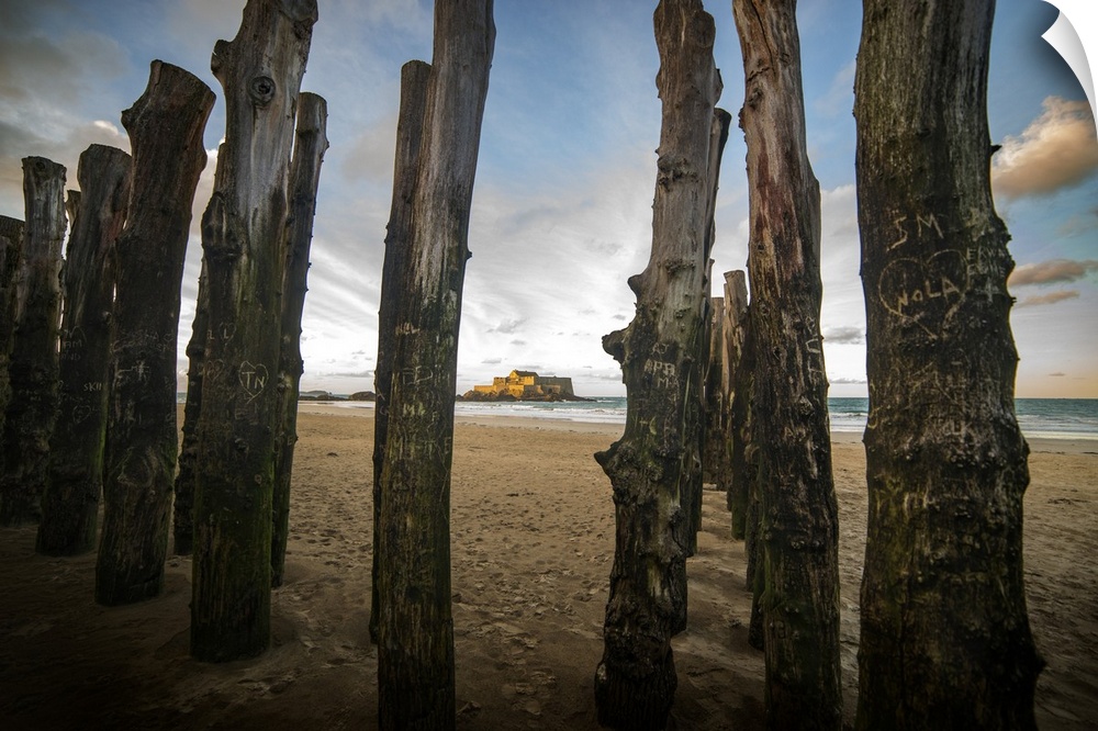 <p>Beach of Saint Malo in Brittany with the "fort national" seing through the "wood - stop waves".</p>