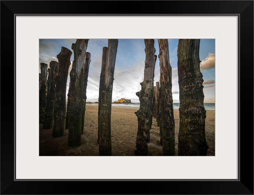 <p>Beach of Saint Malo in Brittany with the "fort national" seing through the "wood - stop waves".</p>