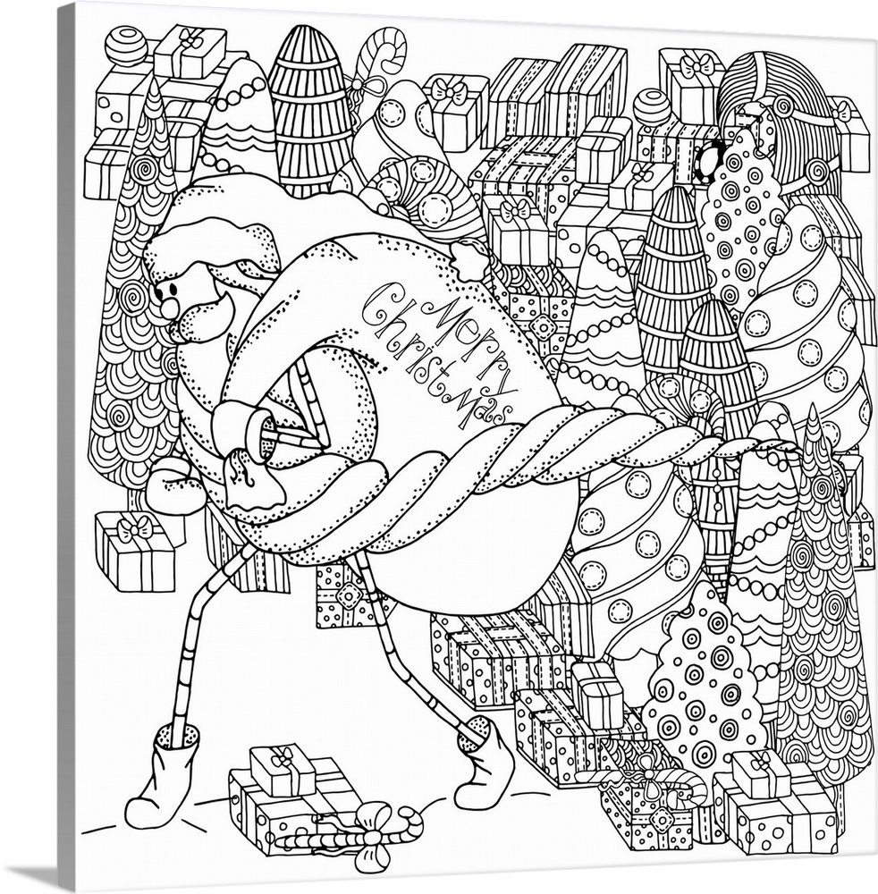 <p>Contemporary line art of Santa Claus against a background of presents. Perfect for Coloring Canvas.</p>
