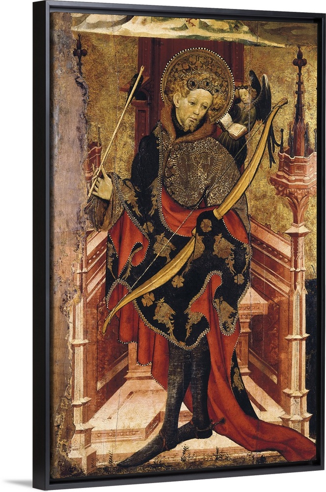 <p>MATES, Joan (14th century-15th century). Saint Sebastian and Crucifixion. ca. 1417 - ca. 1425. Lower detail depicting Saint Sebastian. International gothic. Tempera on wood. SPAIN. Barcelona. National Art Museum of Catalonia. Proc: SPAIN. Barcelona. Pia A</p>