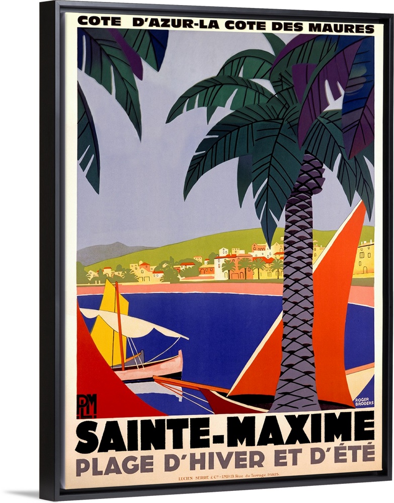 <p>Vertical, large vintage advertisement for Sainte-Maxime, France. Palm trees over a body of water with several boats in it, city can be seen in the distance, French text on the top and bottom of the image.</p>