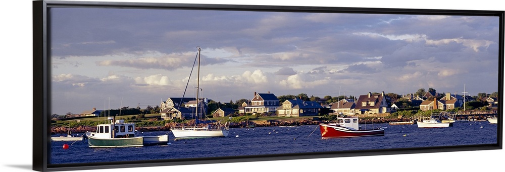 <p>Large landscape photograph of many boast in Sakonnet Harbor, houses line the landscape, beneath a mostly cloudy sky in Rhode Island.</p>