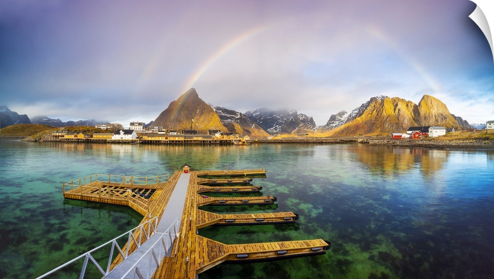 <p>Sakrisoy with rainbow, Moskenes, Moskenesoya, Nordland, Lofoten, Norway</p>