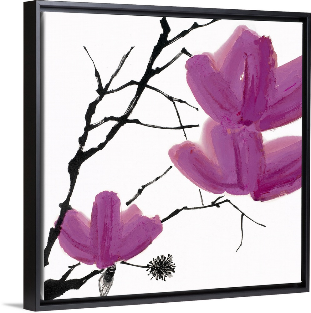 <p>Up-close painting of three flower blossoms on a set of tree branches.</p>