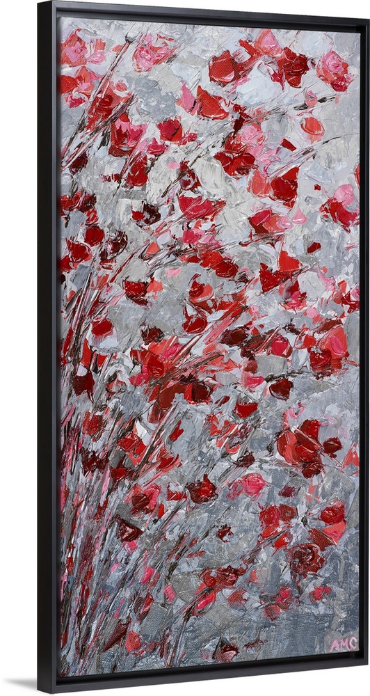<p>Contemporary painting of little red flowers on thin branches resembling a cherry blossom tree.</p>