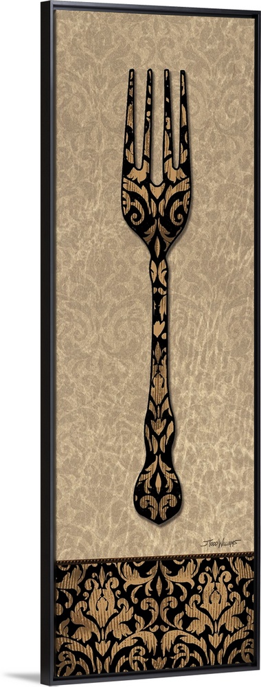 <p>Home decor in brown, black, and gold tones with an illustration of a salad fork with a paisley design.</p>