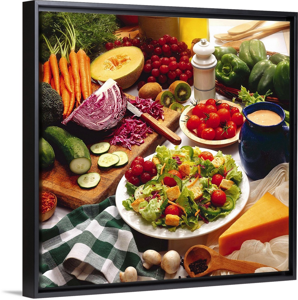 <p>A photographic still life of a table crowded with fresh fruits and vegetables such as cabbage, cucumbers, carrots, tomatoes, bell peppers, mushrooms and the fruits melon, grapes, kiwi and other salad fixings like cheese, peppercorns, and dressing.</p>