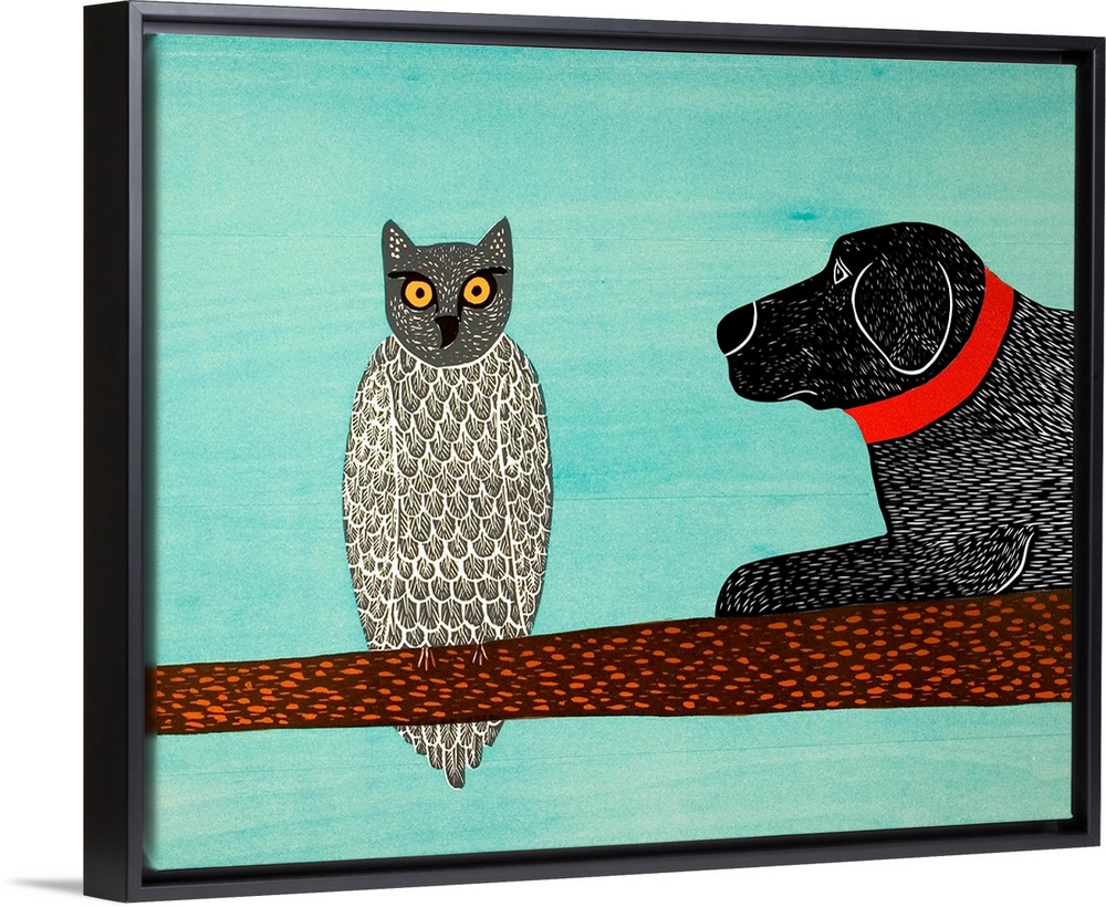 <p>Illustration of a black lab laying on a tree branch next to an owl.</p>