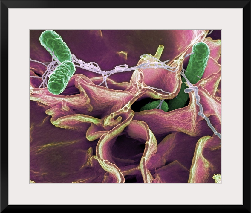 <p>Salmonella bacteria (green), coloured scanning electron micrograph (SEM). Salmonella bacteria can cause food poisoning when they are eaten in contaminated food. Symptoms include abdominal pain, nausea, diarrhoea and vomiting. Magnification: x8700 when printed 10 centimetres wide.</p>