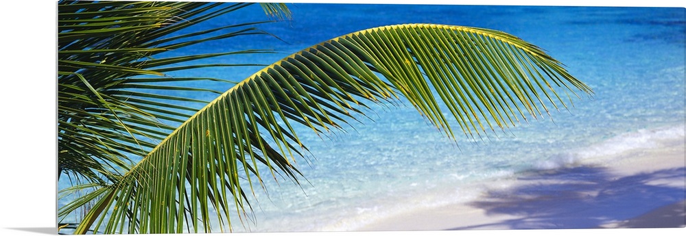 <p>Relaxing panoramic photo of the picturesque Salomon Beach in the Virgin Islands National Park in St. John in the US Virgin Islands. Lush palm fronds create a shadow on the white sand beach with the transparent, crisp, refreshing water in the background.</p>