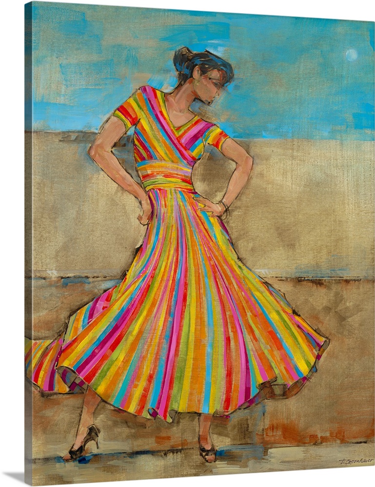 <p>Vibrant contemporary painting of a woman in a flowing, multi-colored striped dress, striking a dynamic pose against a textured blue and tan background.</p>