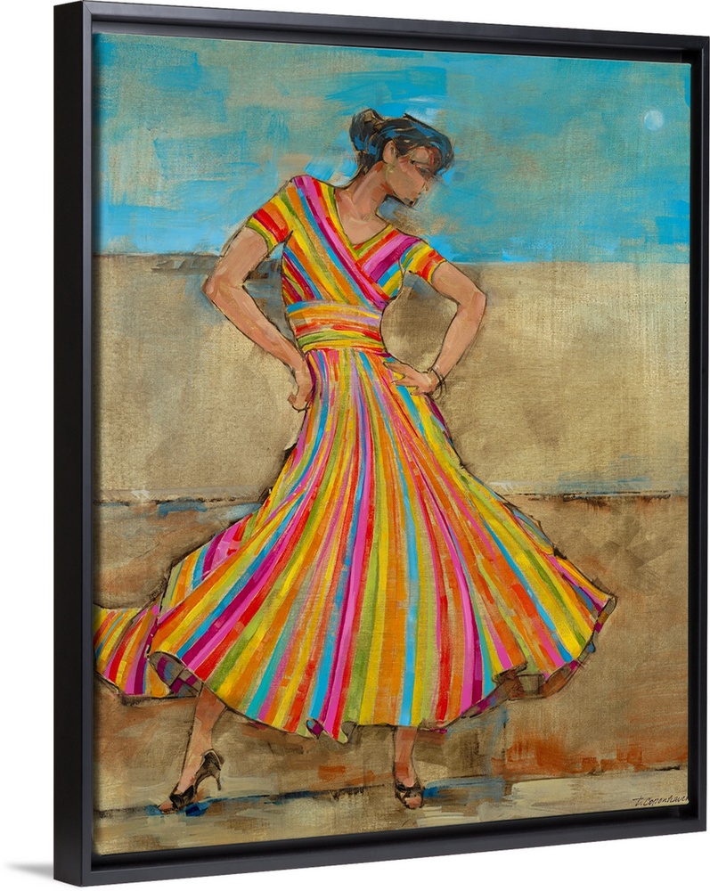 <p>Vibrant contemporary painting of a woman in a flowing, multi-colored striped dress, striking a dynamic pose against a textured blue and tan background.</p>
